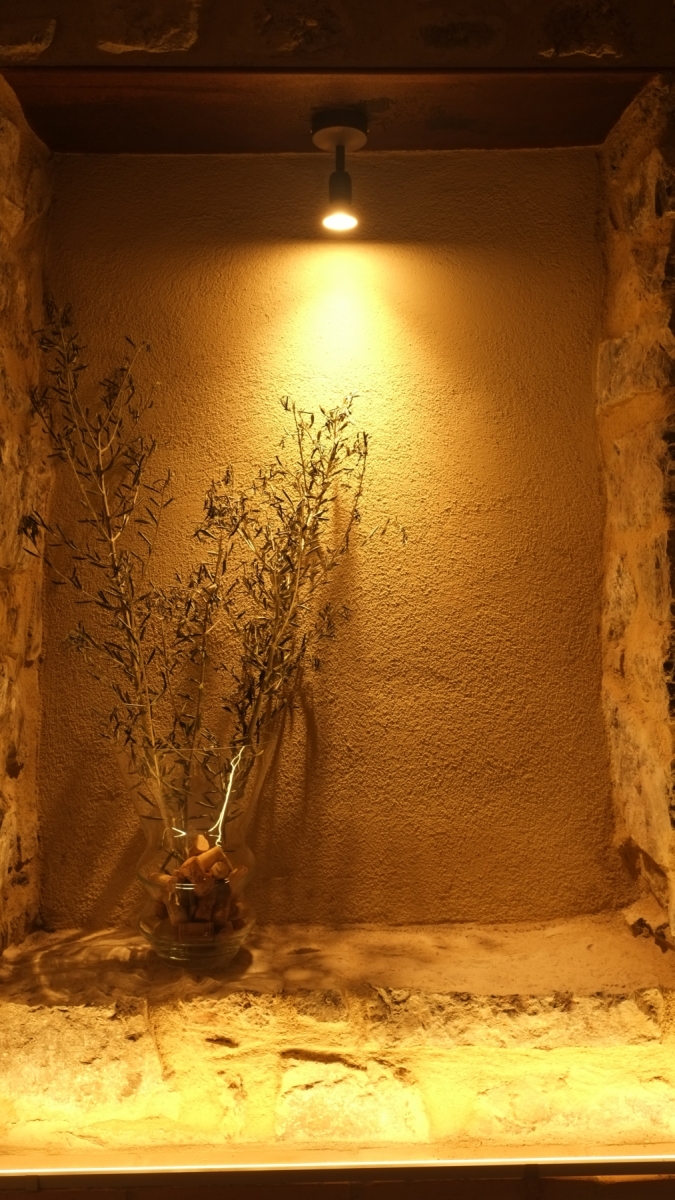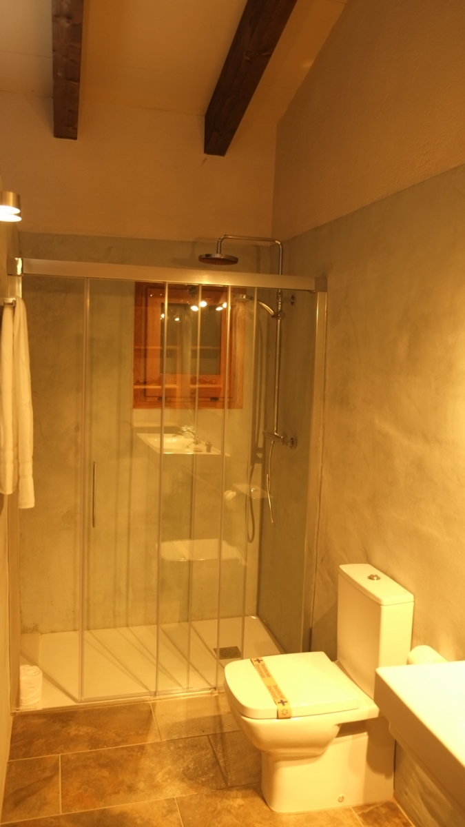 Triple exterior room of 25 m². Original stone walls and high ceilings with wooden beams. Natural and organic wood furniture. Views to the hilly landscape.
