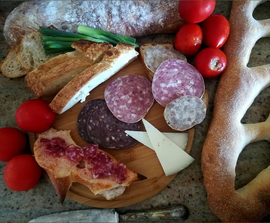 • Pan de payés (de Tramuntana) tostado con ajo y tomates del huerto: El pan de Tramuntana es elaborado por los Panaderos Artesanos de las Comarcas de Girona con trigos de variedades antiguas producidos por la Cooperativa Agrícola de Castelló d’Empúries en el Parque Natural de los Aiguamolls del Empordà.