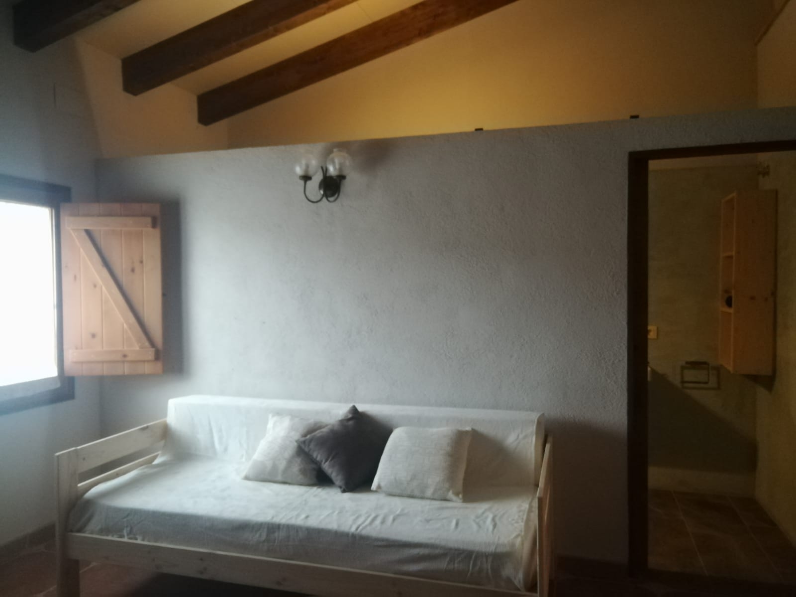 Habitación exterior triple de 25 m². Paredes de piedra originales y altos techos con vigas de madera. Mobiliario de madera natural y ecológica. Vistas a la sierra de Montpedrós.